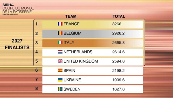 Ce lundi 19 janvier, pendant Sirha Bake & Snack, la victoire de la France, représentée par Yoan Palamara (candidat chocolat), Abel Nesson (candidat sucre) et Axel Lebellanger (candidat glace), et coachée par Franck Michel, vient clôturer deux journées de la sélection Europe de la Coupe du Monde de la Pâtisserie, la compétition de référence de la pâtisserie mondiale. La Belgique se hisse à la 2ème place et l’Italie complète le podium. Les 3 équipes, tout comme les Pays-Bas (4ème) et le Royaume-Uni (5ème), sont dès à présent qualifiés pour la Grande Finale de la Coupe du Monde de la Pâtisserie, qui se tiendra pendant Sirha Lyon, en janvier 2027.